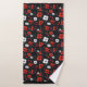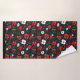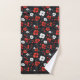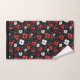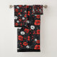 Joli ensemble de serviettes de bain à motif floral rouge et blanc sur fond noir.