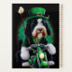 Un ami en fureur derrière les guidons d'une moto verte brillante, portant une tenue verte de la Saint Patrick qui fait tourner la tête. Le chien est habillé d'un ensemble festif, avec une cravate arc-en-ciel verte et un chapeau haut assorti qui se trouve doucement au-dessus de la tête. Le costume présente des motifs complexes de shamrocks et de leprechauns, ce qui indique clairement que ce chien est prêt à célébrer la Saint Patrick avec style.