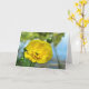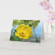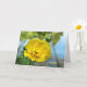 Voici une carte blanche de photographie d'art avec une fleur de beurtasse jaune fleurissant au bord de l'étang pendant une journée d'été. Les reflets de feuilles verts, de nuages blancs et de ciel bleu ajoutent à la belle composition artistique et impressionniste.