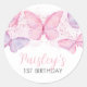 Stickers Cupcake 1er Anniversaire Papillon. Avec des papillons roses et violets et une écriture cursive rose pour faire le plus doux thème papillon pour la fête de 1er anniversaire de votre petite fille.