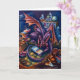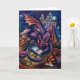 Une carte de voeux avec un dragon lisant dans une bibliothèque de style imaginaire.