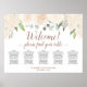 Cet élégant tableau à mariages floraux chic boho peut accueillir 50 convives à 5 tables avec 10 places par table. Il présente une belle aquarelle avec des roses et des fleurs dans des tons de champagne blush ou de pêche très pâle, avec des feuilles d'eucalyptus et de la verdure du jardin. Le titre dit : Bienvenue ! Veuillez trouver votre table écrite en calligraphie de script sophistiquée. Il y a un espace pour les noms du couple et la date du mariage en bas. Une façon merveilleuse d'ajouter beauté et charme rustique à votre réception de mariage, tout en les aidant à trouver leur place.