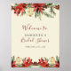 Ce poster de bienvenue présente un cadre fait de branches de sapin luxuriantes, de fleurs de forêt bordeaux, de cônes et de brindilles sur un fond ivoire vintage noble et un texte écrit.