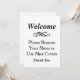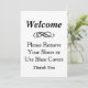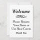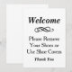 Panneau de bienvenue à afficher lors des visites à domicile avec un design personnalisé noir et blanc élégant : "Bienvenue, veuillez enlever vos chaussures ou utiliser des couvre-chaussures". Personnalisez le texte pour l'adapter à votre occasion.