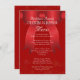 Grand arc rouge, menu de Noël familial modèle. Papier rouge foncé avec texte blanc. Ajoutez le nom de famille en haut (ou supprimez cette ligne de texte). Utilisez le grand espace modèle pour lister les entrées, les boissons, les entrées, les côtés et les desserts faits spécialement pour la période des fêtes. Un léger imprimé de flocon de neige fait une bordure festive des deux côtés de ce papier.