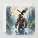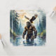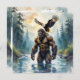 Carte blanche Bigfoot. Un Sasquatch musclé avec un aigle qui atterrit sur son épaule pendant qu'il marche à travers une rivière dans une forêt.