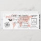 Invitation de billet de mariage billet d'embarquement pour sauver la date avec une carte du monde de destination en feuille de rose or élégante, boussole, avion et un modèle de texte personnalisé.