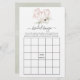 Carte de jeu de bingo de mariage avec des fleurs d'anémone et des feuilles d'eucalyptus dans un cœur géométrique rose gold.
