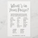Amusez-vous à votre fête avec ce jeu de bingo amusant ! Retournez-le et jouez à Qu'est-ce qu'il y a dans ton sac. Ajoutez votre texte personnalisé en utilisant le formulaire de modèle. Le libellé peut être modifié pour rendre cela approprié pour une fête de bébé, une fête de mariage, un anniversaire, etc.