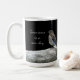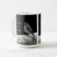 A mug with a photo of a bird perched on a fence against a black background