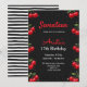 Front of a birthday invitation card with a black background, adorned with red cherries on the borders. "Seventeen" in red cursive, invites to Arieta’s 17th birthday on July 8, 8:00 PM. Back features black and white horizontal stripes.