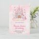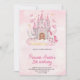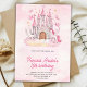Birthday invitation with a pink castle, surrounded by birds and a unicorn, set on a soft pink background. Text invites to "Princess Arletta’s 8th birthday."