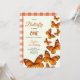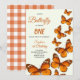 A first birthday invitation card with vibrant orange butterflies on a white background. Elegant script text details event info. The tone is cheerful and celebratory.