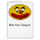 Un visage jaune mignon et drôle avec de grandes lèvres rouges et la langue. Le nez est un triangle rouge. Le visage a aussi de grands yeux noirs et blancs et un sourcil presque unisourd. Un personnage de dessin animé à l'air très idiot. Les mots par défaut sur cette conception sont "Bite Your Tongue!", mais le texte peut être customisé à ce que vous voulez.