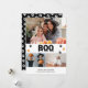 Carte d'Halloween en noir avec un collage photo avec un titre écrit à la main et des empreintes de pattes sur le devant et un arrière - plan noir avec des empreintes de pattes à l'arrière. Personnalisez facilement cette carte d'Halloween en noir avec vos images, un nom de famille et l'année. Cette jolie carte Halloween parfaite pour chat ou amoureux de les chiens peut être transformée en n'importe quelle couleur à l'aide de l'outil de personnalisation.