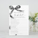 Black Bow "Who Knows The Bride Best" Jeu - Ajoutez un peu de plaisir à votre douche nuptiale avec cette carte de jeu charmant avec un élégant design d'arc noir. Ce jeu "Who Knows The Bride Best" est parfait pour attirer les invités et célébrer la future mariée dans le style. Avec son écriture élégante et ses accents féminins, cette carte de jeu est une belle addition à n'importe quel thème de douche nuptiale, en faisant un souvenir mémorable pour la mariée et ses proches. *** Veuillez saisir H135 dans la recherche de magasin pour trouver tous les articles correspondants *** Ou visitez notre collection Black Bow. *** *** Ce design de haute qualité est facile à customiser pour correspondre à vos couleurs, styles et thèmes de douche. Pour plus de personnalisation, cliquez sur le lien "Modifier en utilisant l'outil de conception" et utilisez notre outil de conception pour modifier ce modèle. Si vous avez besoin d'aide ou d'articles correspondants, veuillez me contacter.
