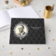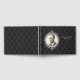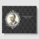 Funérailles / affichage livre d'invités fait en noir sur damas noir motif. Un cadre rond orné d'argent, sur la façade du livre, est prêt pour la photo de vos proches. Personnalisez le texte blanc en fonction de vos besoins.