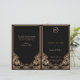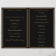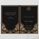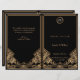 Un élégant programme de mariage de style vintage ou une commande de service avec un thème "The Great Gatsby" des années 1920 dans les tons noir et or. Un arrière - plan noir met en valeur la bordure géométrique complexe de style Art Déco dans les tons beiges dorés. Les monogrammes de Bride et Groom sont mis en surbrillance à l'aide d'une police de couleur gris argenté contrastée. Ce magnifique programme de mariage est conçu pour être plié le long du centre pour créer un programme bi-pli de type carte.