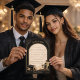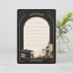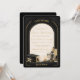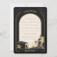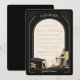 Modern graduation celebration design featuring a black arch frame with gold line accents, set against a soft ivory center. Refined typography paired with cap, diploma, and champagne details creates a polished layout for hosting a graduation gathering with a formal, evening-inspired setting.
