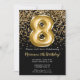 Elégante invitation à la fête de 8ème anniversaire en noir et or pour une fille de 8 ans avec un script élégant écrivant des polices d'or et des ballons de papier amusant.