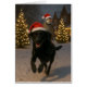 Humorous Christmas card featuring a Black Labrador and a Partridge in an apparent truce over the Christmas period! The Partridge is riding the Black Labrador in a snowy scene with Christmas trees twinkling in the background.