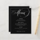 Cette élégante carte de menu à budget noir foncé présente un style classique et ancien avec une calligraphie blanche romantique. Ajoutez votre choix de dîners pour les entrées ou les entrées, le premier plat, le plat principal ou l'entrée, et les desserts. Donnez le ton à votre réception de mariage ou à votre dîner de répétition d'inspiration italienne sophistiquée, ou à vos offres de douches nuptiales, avec ce design élégant et minimaliste.