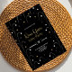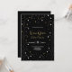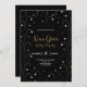 Black New Year invitation card with gold and silver stars and swirls. Text reads "New Year Kitty Party, December 31, 8:00 PM." Elegant and festive.