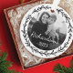 Design moderne festif en noir et blanc couronne de la famille photo ornement design. Le design comprend notre cadre de couronne en feuille blanche et noire dessinée à la main et ajoutez votre propre photo de famille personnalisée, nom et année. Conception par Moodthology Papery.