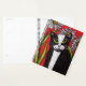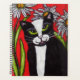Ce planificateur a un chat tuxedo noir et blanc avec des yeux verts assis devant des fleurs de marguerite blanche sur un arrière - plan rouge vif. Le dos est noir.