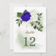 beau tableau de sièges personnalisable numéro carte romantique bleu royal et fleurs blanches avec quelques feuilles verts et parties scintillant d'or carte numéro