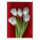 Tulipes molles et blanches sur un arrière - plan de tissu rouge lumineux.