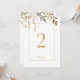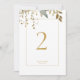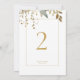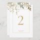 Chic et élégant. Ce magnifique numéro de table de mariage blanc présente des détails de remplissage aquarelle avec des accents d'or imitation. Le design comprend une police contemporaine en imitation or sertie dans un cadre doré fin taupe. La conception est répétée à l'arrière.
