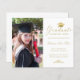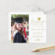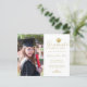 Cette élégante carte de faire-part de graduation photo budget personnalisée présente votre photo à gauche et à droite un faux casquette de grade d'or avec le mot "Graduate", classe/année, nom et autres détails de cérémonie dans la fausse calligraphie de script d'or formelle pour personnaliser sur un arrière - plan blanc. Conçu par Susan Coffey.