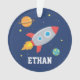 Un ornement avec un vaisseau spatial décollant dans l'espace parmi les étoiles et les planètes sur un fond bleu foncé. Un ornement amusant avec un sens de l'aventure. Personnalisez avec le nom de l'enfant.