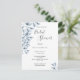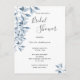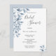 Une invitation branchée à la douche nuptiale en blanc et bleu poussiéreux. Un arrière - plan blanc chic à l'avant. Décoré de sprigs et de feuillage de couleur bleu botanique. Un grand script à main moderne, typographie avec le texte : Fête des mariées. Modèles pour que la mariée soit le nom et les détails du parti. Texte gris foncé. Dos : arrière - plan bleu poussiéreux. Conseil : Si vous ne voulez pas qu'il ressemble à une carte postale, cliquez sur customiser, allez à l'arrière et retirez le séparateur et le timbre postal.