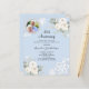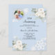 Pour un 25ème anniversaire de mariage élégant et romantique. Arrière - plan bleu clair décoré de fleurs blanches, rose et dentelle blanche. Personnalisez et ajoutez votre photo, vos noms et vos détails. 1 feuille = 1 invite imprimé bord à bord.