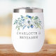 Fleurs de pivoines blanches gaies et feuilles d'aquarelle verte forment une belle frontière sur une jolie tondeuse à vin de mariage bleu fleuri personnalisée pour votre élégante réception de jardin. Customisez avec vos noms sous le beau bouquet pour un doux saké.