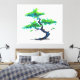 aquarelle minimaliste d'un petit bonsaï avec des feuilles brillants dans de nombreuses nuances de vert poussant d'un tronc bleu comme une impression de toile décorative.