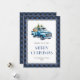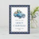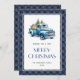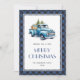 Cartes de Noël personnalisées en carton bleu rétro avec camion bleu. Personnalisez facilement ces cartes de Noël de camion bleu aquarelle enneigée avec votre nom de famille.
