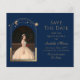Bleu céleste Enregistrer la date Anniversaire Quinceanera Invitation présente un cadre de soleil doré, de lune et d'étoiles sur un arrière - plan bleu. À l'intérieur est votre photo préférée et votre Quinceanera personnalisée enregistrer les informations de date. Personnalisez en modifiant le texte dans les zones de texte et en ajoutant votre photo préférée. Conçu pour vous par ©2024 Evco Studio www.zazzle.com/store/evcostudio