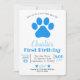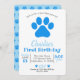 Une jolie invitation d'anniversaire d'empreinte de patte bleu et blanc pour votre meilleur ami. Travaille aussi pour les enfants qui aiment leurs petits. Trouvez les articles correspondants dans notre boutique, y compris les casquettes d'anniversaire correspondants et une version photo de cette invitation.