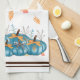 Toile de cuisine citrouille couleur bleu automne. Serviette de cuisine tendance et mignonne avec citrouilles bleus avec arcs orange et arcs noirs et blancs. Les citrouilles sont entourés de feuillage et de feuilles colorés qui tombent. Arrière - plan blanc.