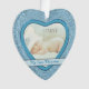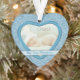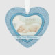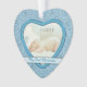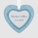 Cette ornementation de vacances en saké présente votre propre photo de bébé encadrée dans un joli cadre bleu de coeur bordée d'argent. Le cadre du coeur est bordé d'un motif tourbillon bleu assorti. Une bannière bleue plus légère tient votre texte customisé ; faites-le dire ce que vous voulez ! L'arrière de l'ornement a la même bordure motif tourbée bleue florale et le cadre en forme de coeur avec du texte supplémentaire à l'intérieur. Cela fait un beau cadeau de conservation pour les nouveaux parents.