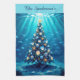 Une scène sous-marine géante avec un sapin de Noël orné d'étoiles de mer dorées et de coquillages éclatants. La lumière du soleil filtre à travers l'eau d'en haut. Des bancs de poissons tropicaux nagent autour de l'arbre.