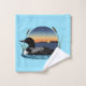 Un huard sur un lac au coucher du soleil et des cailloux sur fond de bleu