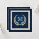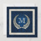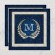 Couronne de laurier perle avec cadre perlé sur un riche arrière - plan damassé bleu.