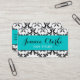 Conception de carte de visite élégante de coiffeur de motif de damassé par le © d'Elke Clarke. Plus de couleurs et de styles disponibles chez www.zazzle.com/damaskgallery. Une belle, souple conception de damassé noire et blanche avec une ligne bleue arrière - plan d'aqua. Votre nom et profession sont sur l'avant de la carte dans une police à la mode de manuscrit et votre information d'affaires est sur le dos. Personnalisable avec votre couleur de l'information et d'arrière - plan.