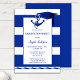 Invitation à la remise de diplômes en bleu et blanc de la Marine avec un design nautique minimaliste avec ancre et casquette de graduation.