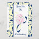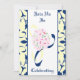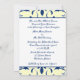 Cette carte de faire-part de mariage est décorée d'un bouquet de Mariée superposé sur un arrière - plan blanc et les mots "Join Us in Celebrating" encadrés de barres damassées de Sodalite Blue et Lemon.