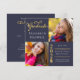 Élégant et chic ton bleu et or, carte d'annonce de remise de diplôme et d'invitation à la fête à deux photos. Caractéristiques avec le mot "Diplômé" en lettrage or scripté et l'année "2026" en lettrage or vertical sur le devant avec vos photos dans les coins opposés. Des champs sont prévus pour le nom du diplômé, la date de remise des diplômes, l'école, le collège ou l'université et les projets futurs au recto. Au verso se trouve un design d'invitation à la fête de remise des diplômes coordonné, avec également des accents de ton doré. Conception de Holiday Hearts Designs (droits réservés).